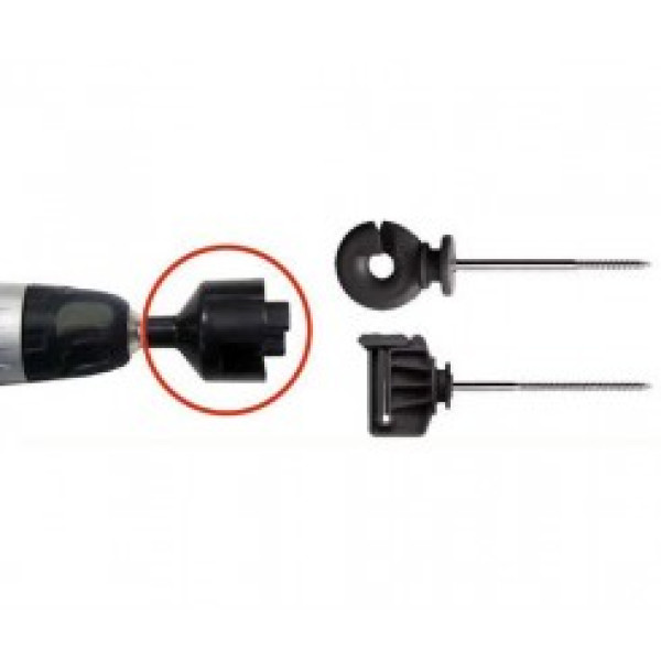 Este accesorio se coloca en la cabeza de un taladro y con él podrá atornillar todos nuestros aisladores con mayor facilidad a las estacas de madera o arboles.