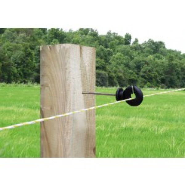 Aislador de tirafondo separador que se inserta en el poste de madera por medio de una varilla metálica de 10 cms de longitud, fabricado en plástico virgen, resistente a los rayos solares.