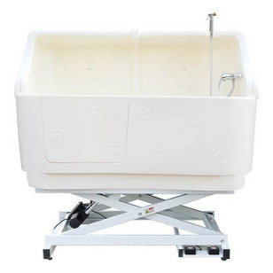 Instalar la bañera sobre una superficie nivelada y montar la extensión trasera siguiendo las instrucciones incluidas. Conectar a la red eléctrica. Ajustar la altura mediante pedales o mando antes de introducir al animal y regularla durante el baño para mantener una postura ergonómica.
