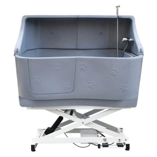 Instalar la bañera sobre una superficie nivelada y fijar la extensión trasera siguiendo las instrucciones incluidas. Conectar a la red eléctrica. Ajustar la altura mediante pedales o mando antes de introducir al animal y regularla durante el baño para mantener una postura ergonómica.