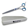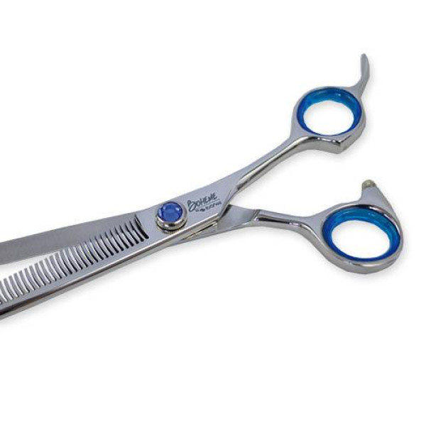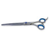 Tijera profesional de esculpir para peluquería canina, con dientes en uno de los filos.