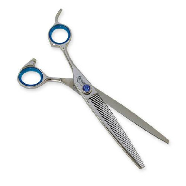 Para el vaciado de pelo muy denso como el de las razas de capas dobles son aconsejables tijeras con otro diseño (dientes más separados).