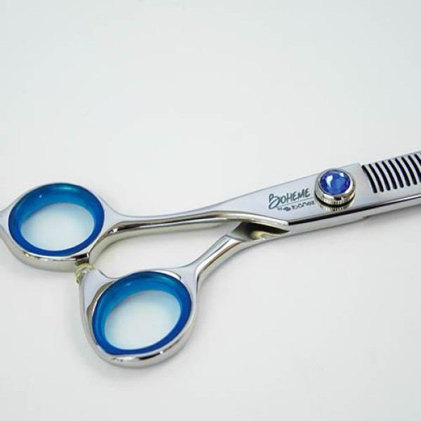 · Tornillo de ajuste decorado con una piedra entallada azul. Permite ajustar la tijera a cada clase de pelo y al gusto personal.