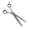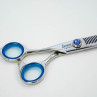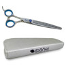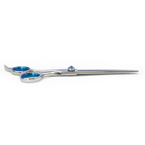 Tijera de esculpir profesional para peluquería canina, con dientes en uno de los filos, diseñada para usuarios zurdos.