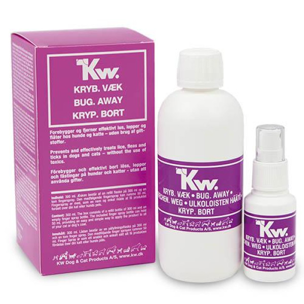 Bug Away de Kw. es un producto para perros y gatos, que previene y trata las infestaciones de insectos como pulgas, garrapatas, piojos, etc.