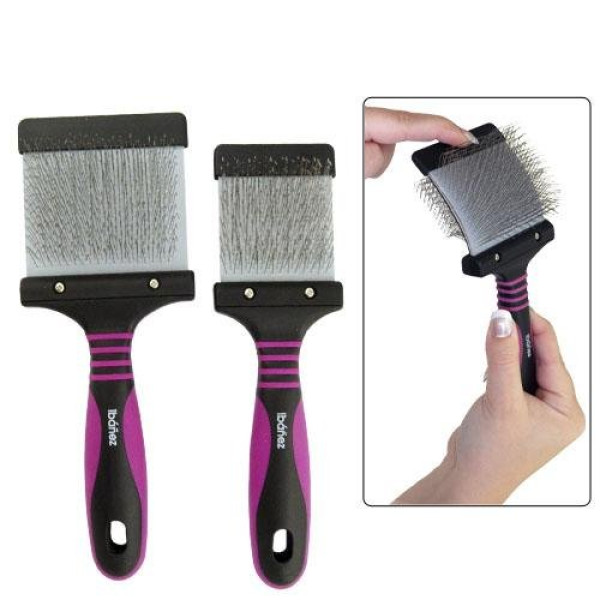 La flexibilidad de la raqueta y la suavidad de las púas hacen de esta carda un instrumento imprescindible para aquellos trabajos en los que cada pelo es importante.