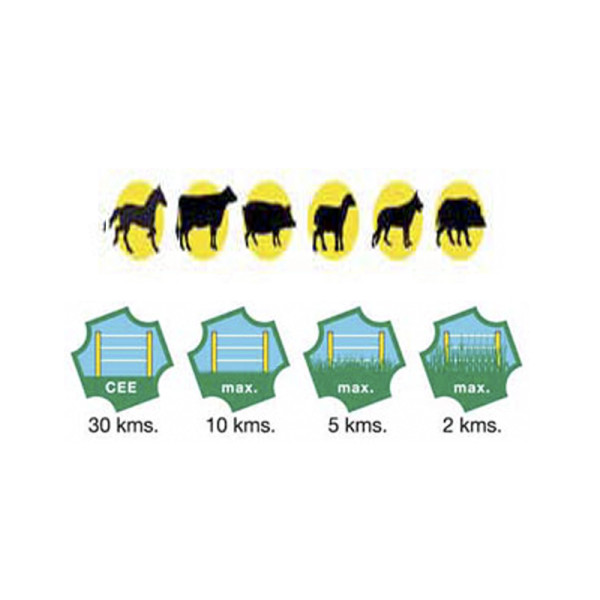 - Longitud de cercado de hasta 30 kilómetros en condiciones óptimas del cercado.