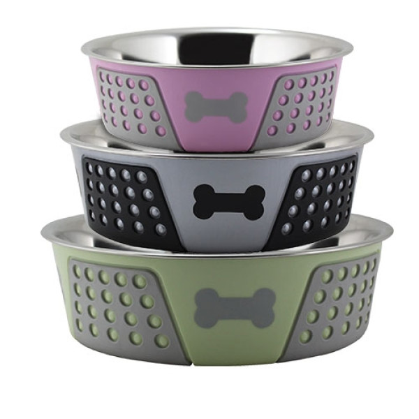 Estos comederos fabricados en acero inoxidable tienen el exterior recubierto de plástico y goma. Estos materiales se combinan entre sí con diferentes colores, y están decorados con la silueta de un hueso. El resultado es un comedero-bebedero de atractivo y moderno diseño.