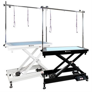 Conectar la mesa a la red eléctrica y seleccionar el color deseado en el pedido. Ajustar la altura mediante los pedales antes de colocar al perro. Activar la iluminación LED desde el interruptor integrado y asegurar al animal con la horca y los lazos.