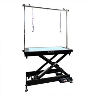 Conectar la mesa a la red eléctrica. Ajustar la altura mediante los pedales antes de colocar al perro. Activar la iluminación LED desde el interruptor integrado según las necesidades del trabajo. Utilizar la horca y los lazos para asegurar al animal.