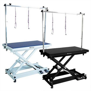 Conectar la mesa a la red eléctrica. Seleccionar el color deseado en el pedido. Ajustar la altura mediante los pedales antes de colocar al perro. Utilizar la horca y los lazos para asegurar al animal. Desplazar la mesa únicamente cuando esté sin carga.