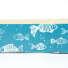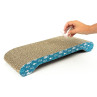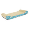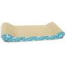 Rascador de cartón ondulado para gatos, con laterales en azul con dibujos de peces blancos.