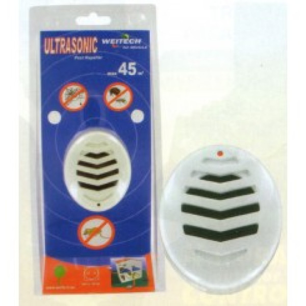 Repepelente para eliminar ratones e insectos de su hogar, su funcionamiento es a través de ultrasonidos, alcanzando un radio de acción de 45 metros cuadrados.